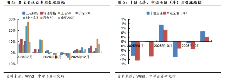 1月各主要权益类指数涨跌幅为:上证指数上涨3.76%、深证综指上涨6.04%、上证50指数上涨1.17%、沪深300指数上涨1.65%、中证A500指数上涨4.52%、创业板指上涨4.47%、科创50指数上涨12.29%、中证2000指数上涨8.16%。