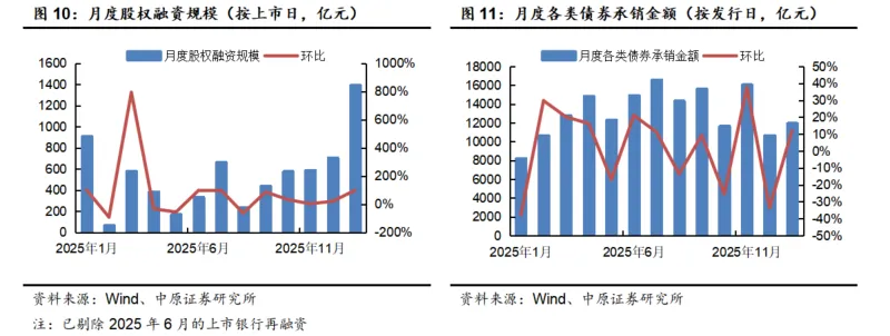 债权融资方面,2026年1月行业各类债券承销金额为11931亿元(按发行日),环比+12.0%,同比+45.8%。