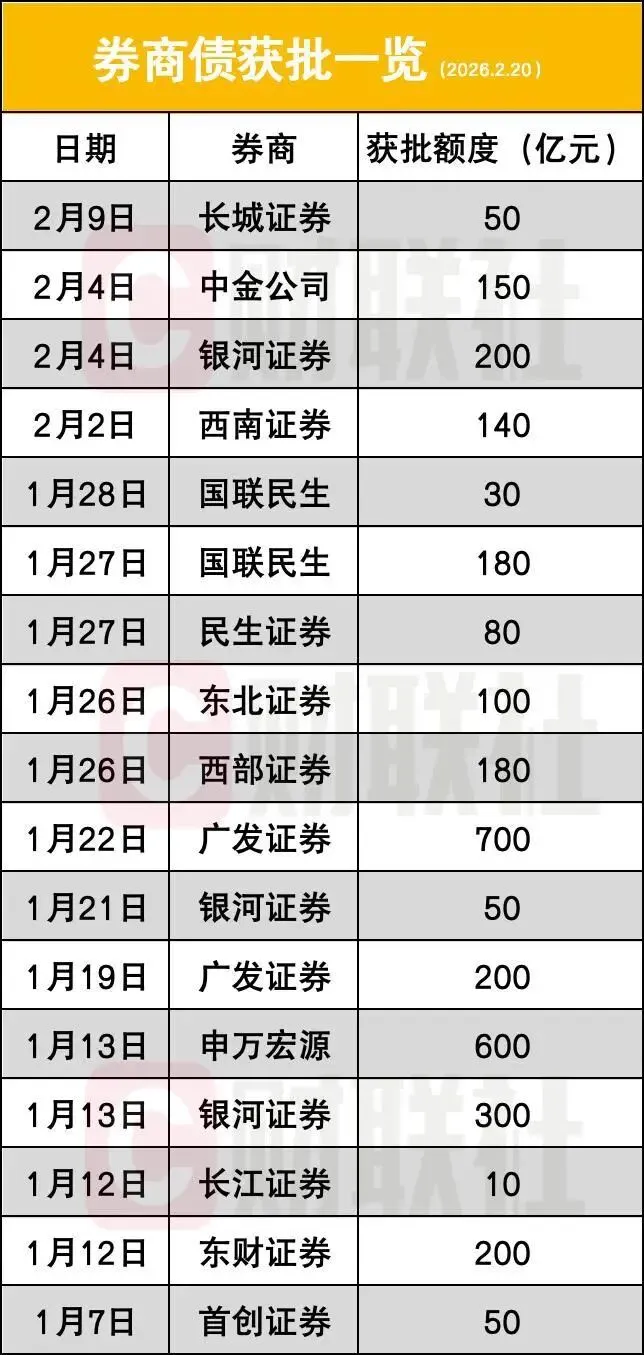 与巨额发债落地同步的是,券商发债获批力度也空前加大,为后续发债提供充足保障。截至2月20日,今年以来券商债券获批额度已高达3220亿元,剔除春节假期影响,近一个半月内券商密集发布发债获批公告,次数超16次,共有13家券商获得年内发债批复。