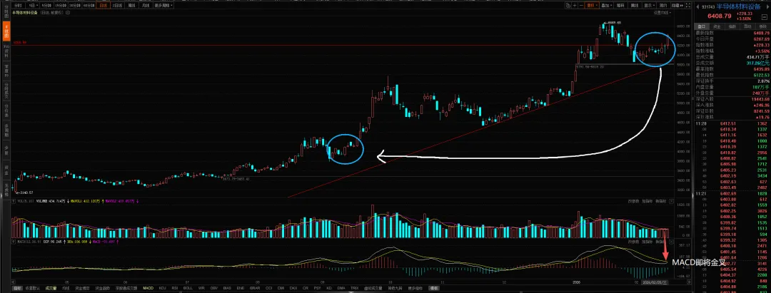 我们可以看到半导体设备的技术形态上,MACD是即将完成金叉的动作(见上图)。