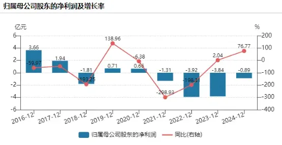 2021年至2024年,锦龙股份公司分别实现营业收入10.06亿元、2.47亿元、1.92亿元,6.63亿元,归母净利润分别为-1.31亿元、-3.92亿元、-3.84亿元和-0.89亿元,此前已经连续亏损四年。截至2024年年末,锦龙股份合并负债总额达191.96亿元,资产负债率攀升至81.09%,同比增加3.92个百分点。