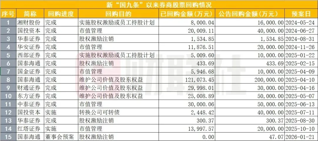 Wind数据显示,自2024年4月12日新“国九条”推出以来,已有12家券商发布15项股票回购预案。其中,湘财股份、财通证券、东方证券、国金证券、国泰海通、华安证券、华泰证券、西部证券和中泰证券已完成股票回购,合计回购金额达到25.92亿元。国投资本和红塔证券的股票回购仍在实施中。
