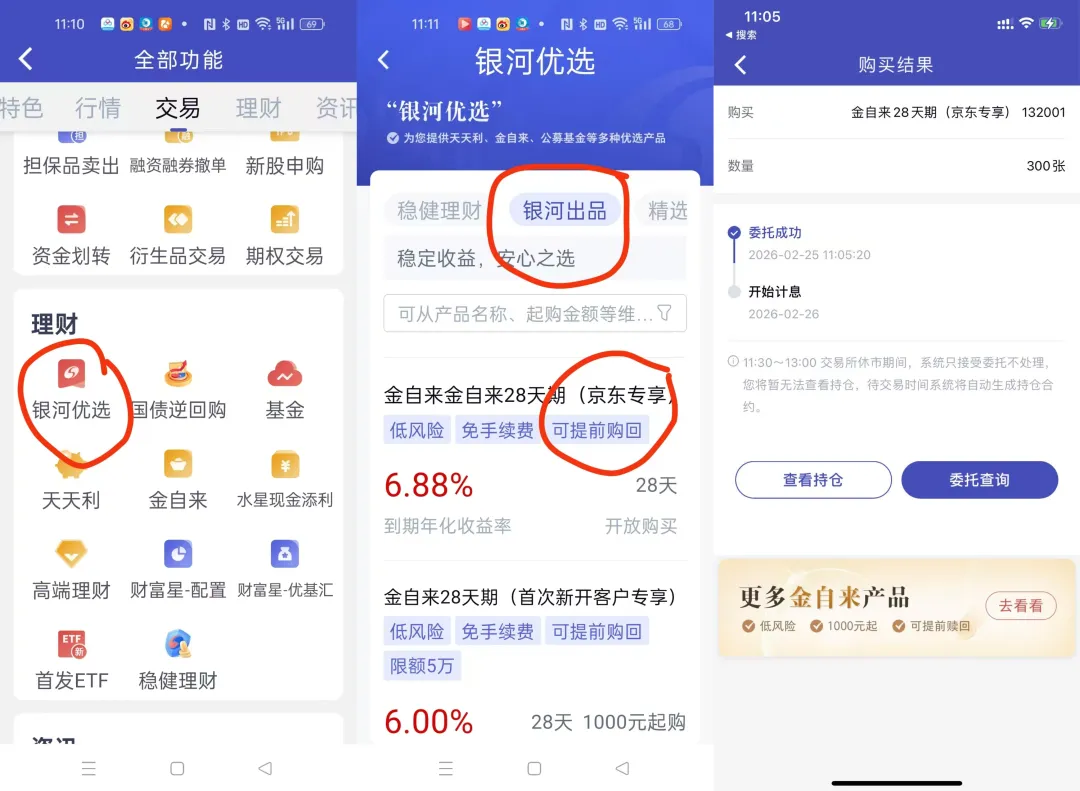 路径:理财--银河优选--京东专享(或者直接首页搜:京东专享)
