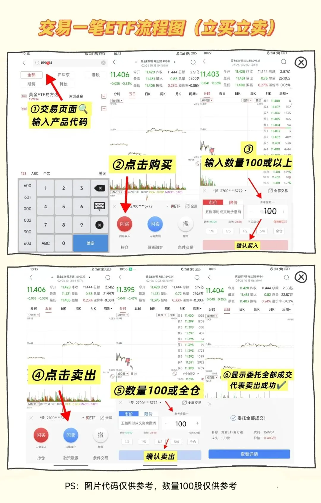 打开券商app——进入委托交易界面——选择买入/卖出——输入对应的股票代码、委托数量、委托价格——下单委托。下图以为黄金ETF为例:
