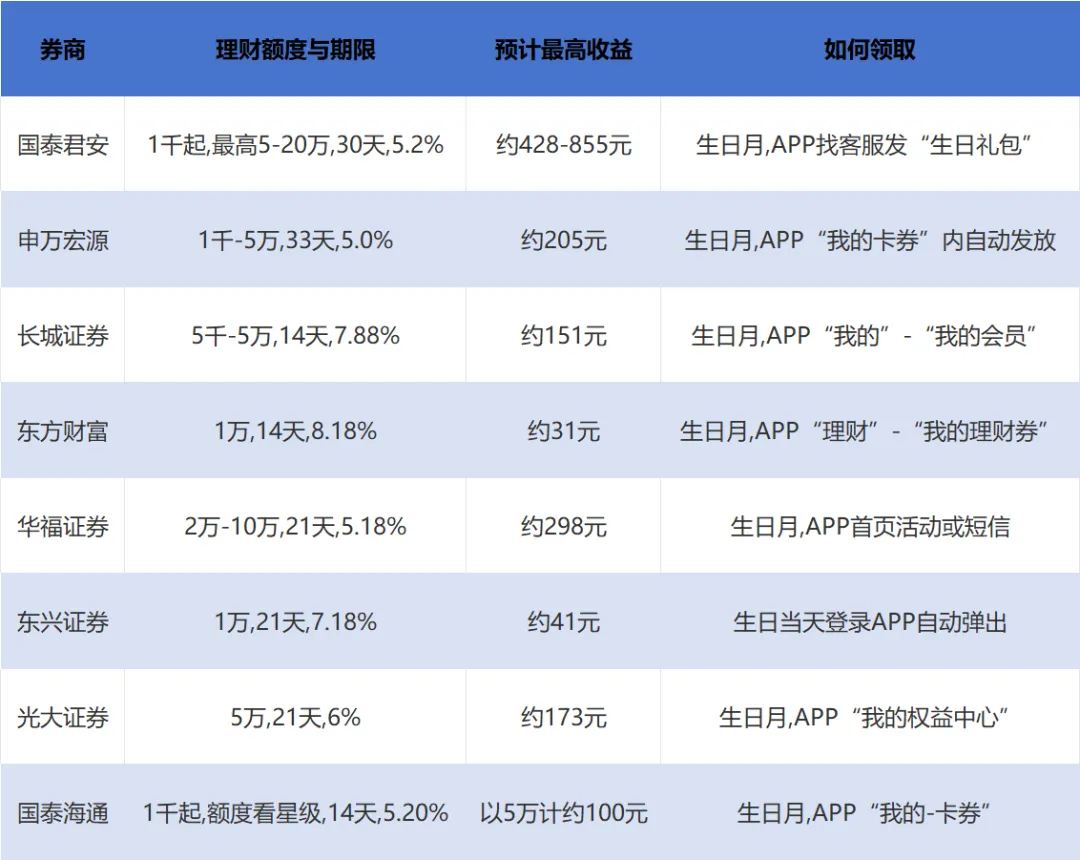 本月及下月过生日的朋友们,除了收获祝福,别忘了登录你的证券账户——多家券商为你准备了专属生日理财券,通过简单的认购操作,就能让闲置资金在短期内获得一笔稳健的额外收益,相当于券商送你的“生日现金红包”。