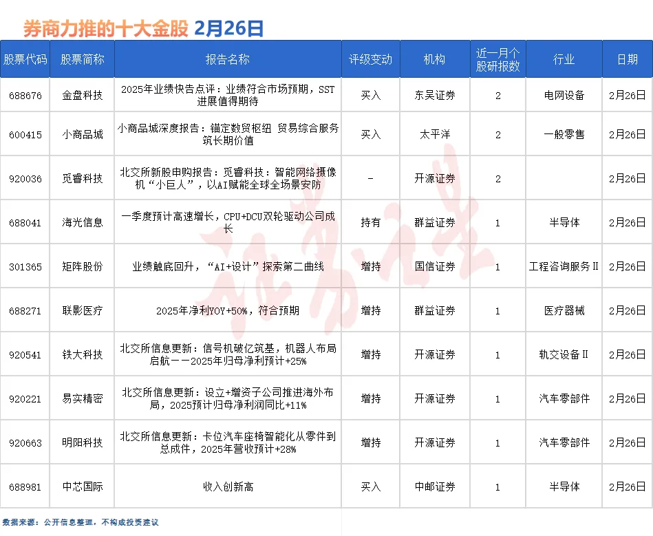 金盘科技最受券商关注,仅2月26日就有国金证券和东吴证券等2份券商研报关注,位居2月26日券商力推股榜首。