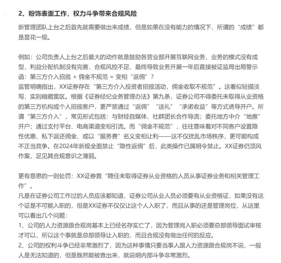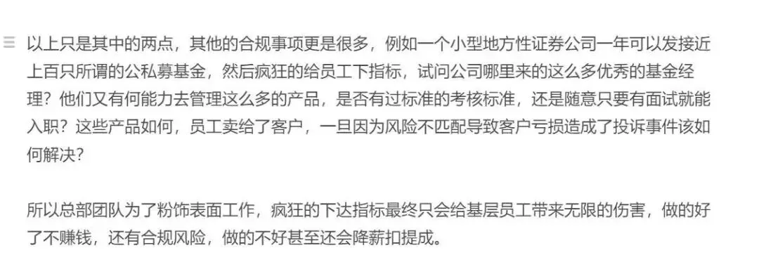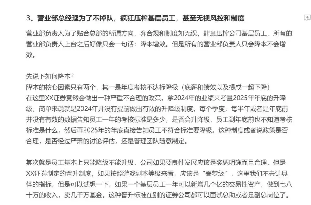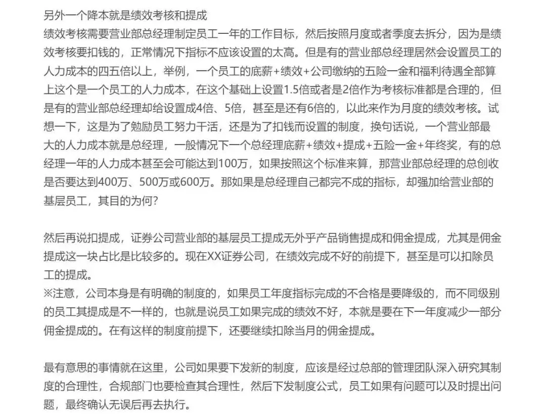某最北部券商的瓜!压榨基层、极致考核、提成乱扣最近接粉丝爆料,最北部证券各种骚操作引发员工连翻吐槽。此前金石杂谈曾写过一篇,这又来一篇吐槽。核心内容是,这家券商权利斗争之下,员工的生存危机越来越大。大背景: 前些年A股调整让很多地方券商卷入业绩恶性循环,其次是基金新规导致证券公司代销基金的营收减少;而错误的券商机制和管理者让业绩更是雪上加霜。1)换帅的本末倒置: 从总部管理团队到营业部总经理全面大换血,以期通过改变新鲜血液改变现状。比如总部核心管理团队负责人是新换的,据说挖自南方某头部券商;入职之前,遭到大部分原有管理层反对,其个人能力和资源也无法胜任,但贵在背后有力量推动。该管理人入职之后就各种骚操作: 一是给大部分营业部总经理换岗位,新招聘负责人或是轮岗。关键的问题的是,很多营业部总经理入职转正都是凭借买资源,转正之后资源锐减,创造业绩甚至不如一名普通理财经理。而且各种的欺上瞒下,向上管理,向下铁血政策,完不成就扣绩效,且各种乱扣绩效。2)粉饰表面工作,权力斗争带来合规风险。公司负责人上台后最大的工作就是鼓吹各营业部开展互联网业务,但业务模式不清,利益分配不全,合规风控不足。最终引来证监局警示: 第三方介入招揽+佣金不规范,是否变相返佣?2024年政策层面已全面禁止返佣,该券商仍顶风作案。3)营业部总经理为了不掉队,疯狂压榨基层员工,甚至无视风控和制度,只只降本不知增效。年度考核不达标降级,该券商竟然拿24尿业绩考量25年年底的升级降级;员工基本只能降级不能升级,制定的晋升制度也很奇葩,基层一年要新增几个亿的资产,做到七八十万的收入,卖几千万基金,跟其他公司面试总助或副总一个级别了。绩效考核也很离谱,有的营业部总经理会设置人力成本的四五倍甚至六倍,一般1.5倍或2倍的标准是合理的,员工纷纷认为这是为了扣钱而设置的。员工灵魂发问,一个营业部总经理的人力成本可能达到1000万,是否绩效考核也应该四五千万?扣提成更是无底线,一般绩效不达标,下一年度或减少员工提成,但是该券商还继续扣当月的佣金提成。关键,这不是制度型规定,也没有合规部门评估,只是总部领导口头通知各营业部总经理,扣除20、30%并不少见,更有甚至,全部扣除。该员工还爆料了女员工的惨状,营业部总经理在酒场经常带女员工参加酒局,不仅陪喝酒,还要给结账,不同意就威胁,成功了就揽入自己功劳。最后,该员工的的灵魂发问、无奈和思考。
