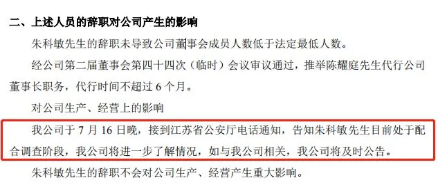 值得注意的是,就在辞职报告递交当晚,东海证券接到江苏省公安厅电话通知,告知朱科敏目前处于配合调查阶段。“公司将进一步了解情况,如与公司相关,将及时公告。”东海证券强调,朱科敏并未持有公司股份,其辞职未导致公司董事会成员人数低于法定最低人数,不会对公司生产、经营产生重大影响。