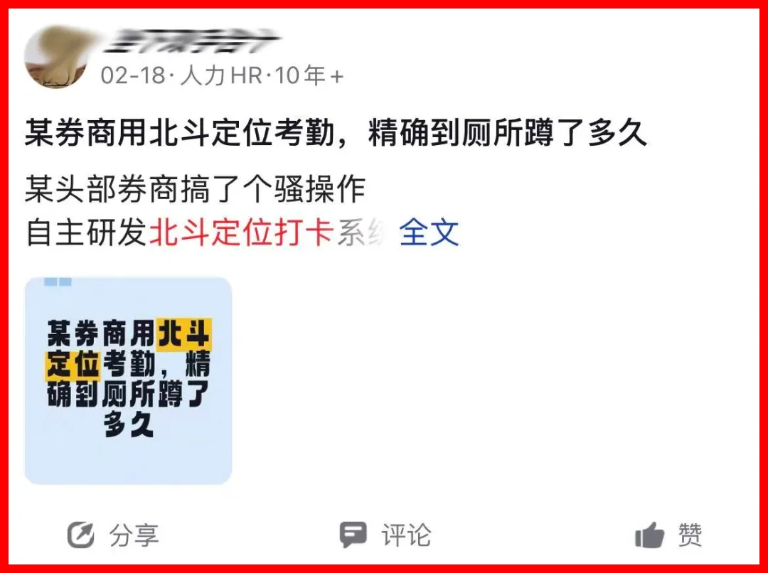 在这样的大环境下,利用科技手段加强管理本无可厚非。问题是,当管理从“交易行为监控”外溢到“肉身位置监控”,从“合规监测”蔓延到“如厕追踪”,工具理性就已经越过了合理边界。北斗定位系统的本质,是将重器降维成“电子镣铐”,用军工级的精度来消解员工最后一点物理隐私。