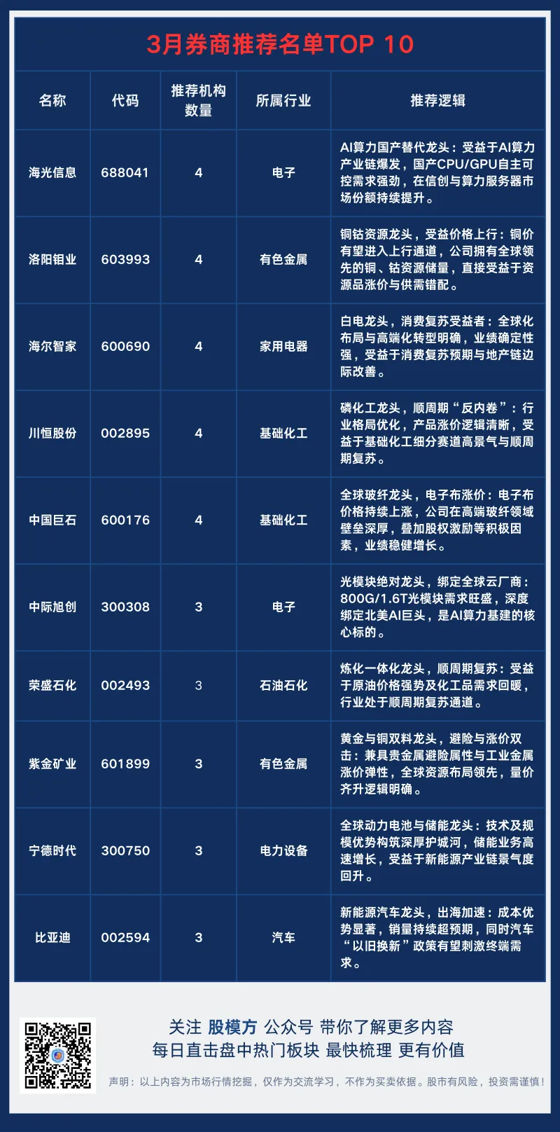 从个股推荐频次来看,海光信息、洛阳钼业、海尔智家、川恒股份和中国巨石成为3月最闪亮的星,均获得4家券商联合推荐。此外,中际旭创、荣盛石化、紫金矿业、宁德时代和比亚迪也表现不俗,均获得3家券商推荐 。