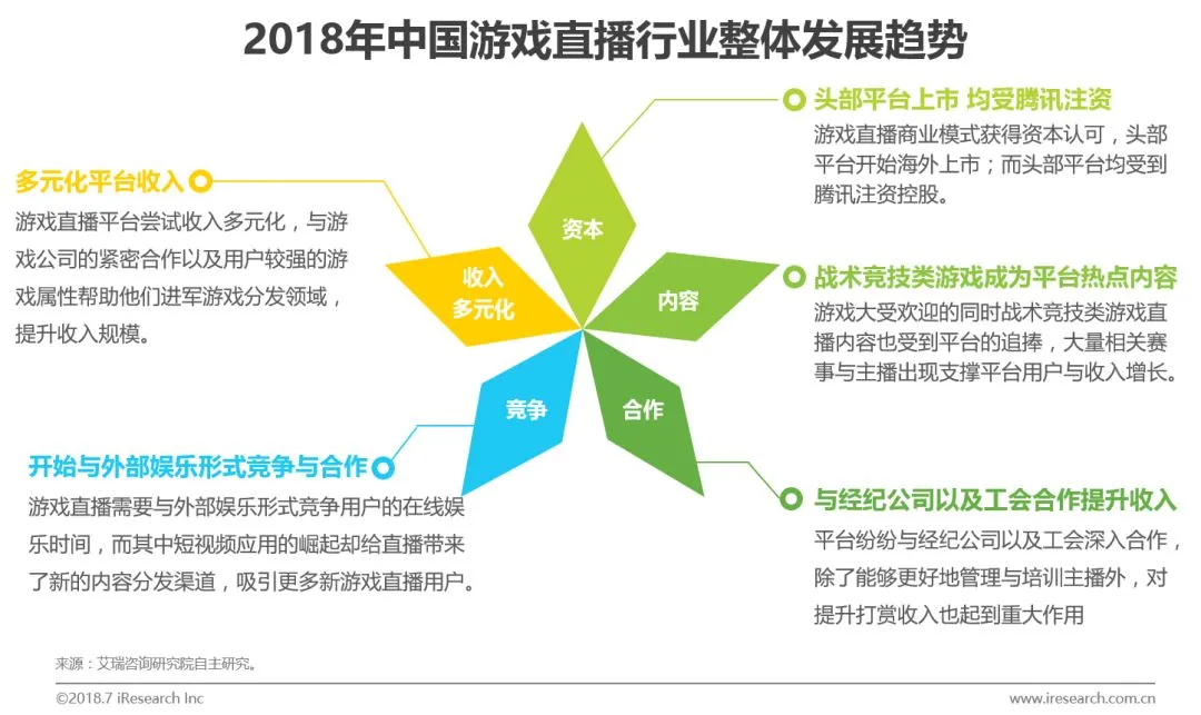 资本:头部游戏直播平台(如虎牙)登陆海外上市,行业内部开始兼并整合;腾讯注资控股多个头部游戏直播平台确保控制游戏内容传播渠道。