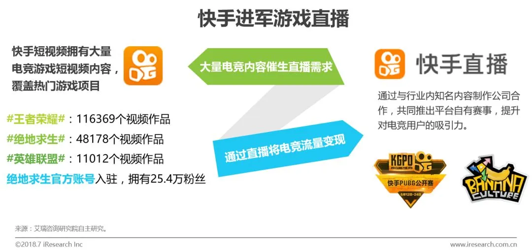 头部短视频平台均开拓了直播业务,证明直播业务契合短视频平台。而快手则更进一步,在游戏直播内容上进行布局,对主播阵容以及赛事内容进行投资,并且通过原有短视频内容导流。而随着《绝地求生》赛事内容的持续火热,快手与香蕉计划共同打造了KGPO快手公开赛,旨在通过高质量独家赛事吸引新的游戏直播用户。