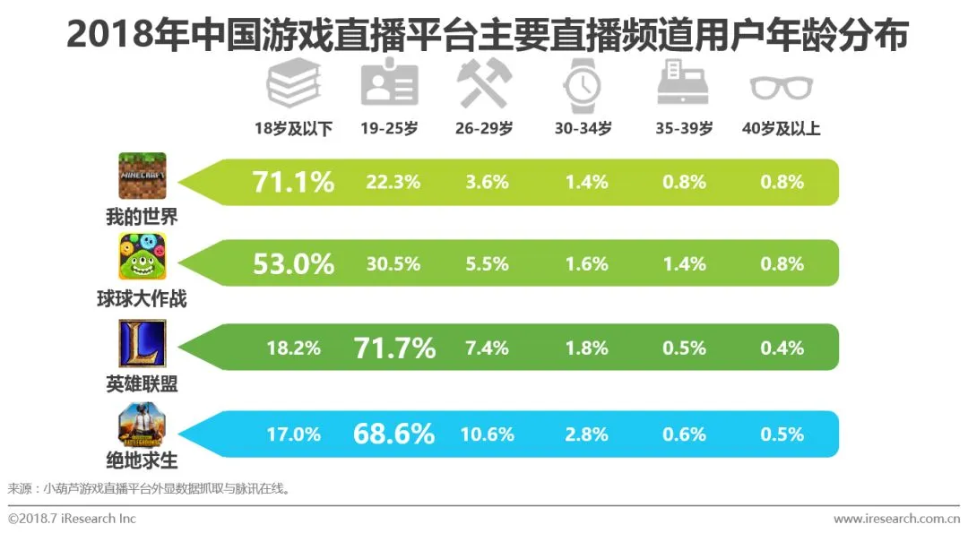 各个游戏直播频道的用户年龄结构差异加大,这与该频道的主题游戏有着直接联系。《我的世界》这款游戏拥有最高的18岁及以下观众占比,高达71.1%;《球球大作战》紧随其后,18岁及以下用户占比为53%。值得注意的是,《英雄联盟》与《绝地求生》两者用户年龄结构相近,说明尽管游戏类型不同两者在受众年龄层上具有一定相似性。