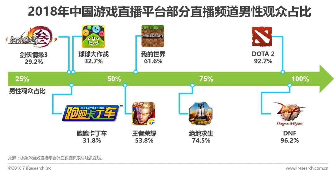 游戏直播平台的各个频道性别占比同样与性别有着紧密的联系。值得注意的是,近年来火热的《王者荣耀》的直播男女观看占比接近1:1,观众性别相对平衡。可以说,《王者荣耀》在对女性用户的直播观看引导上取得了较好的成绩。