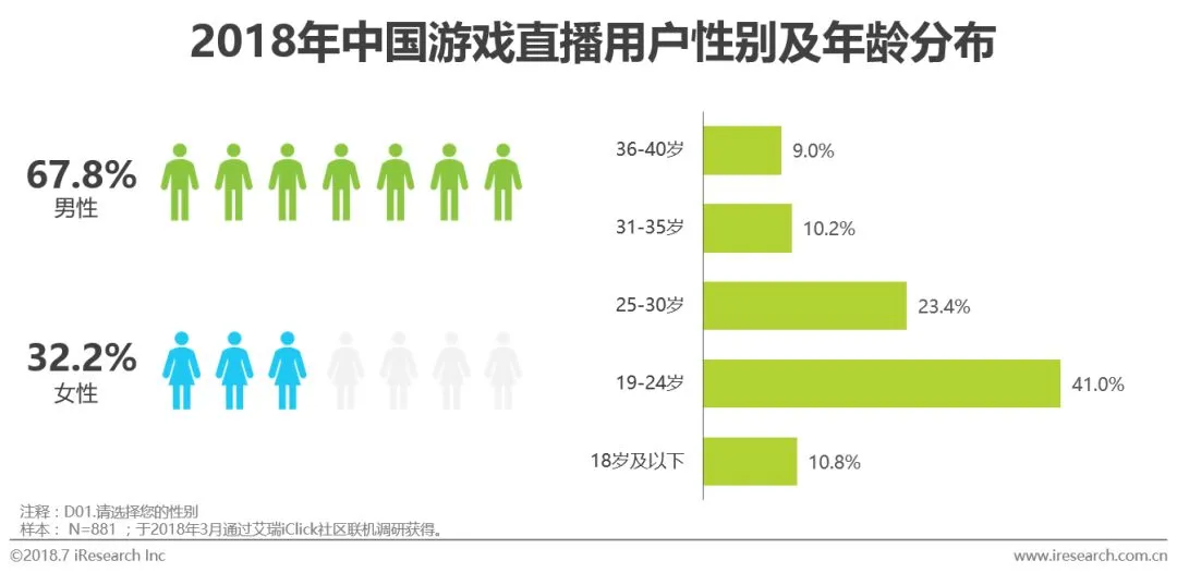 游戏直播用户整体仍以男性为主,这也与整体游戏用户属性相近。另一方面,从年龄上来看整体游戏直播用户仍以30岁以下用户群为主,其中19-24岁群体的数量占比最高,该年龄段对应我国大学生群体,同样也是游戏的主要受众用户。