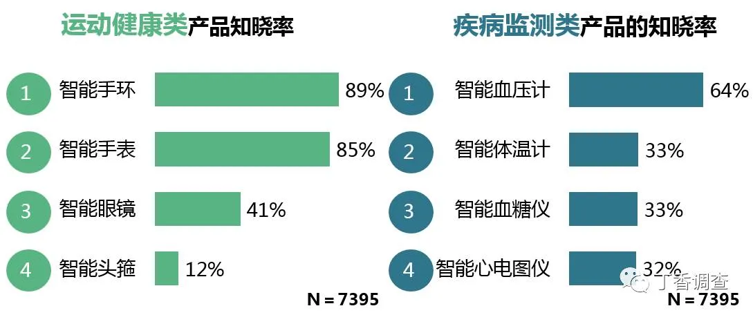 在众多智能可穿戴医疗设备中,知晓率最高的产品分别是智能手环、智能手表、智能血压计;整体来看,运动健康类产品的知晓率比疾病监测类高。