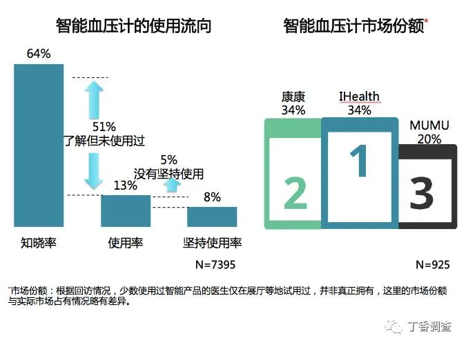 智能血压计主要是利用多种通信手段,将传统血压计的测量数据上传到云端,让血压计的使用者及其亲朋好友能够在任何时间、任何地点看到使用者的血压测量数据。64% 的医生都了解过智能血压计,其中 13% 的人使用过,目前只有 8% 的人还在坚持使用。智能血压计市场中,国产品牌表现不俗, iHealth和康康市场份额相近,分别位列第 1、2 位,MUMU位列第 3 位。