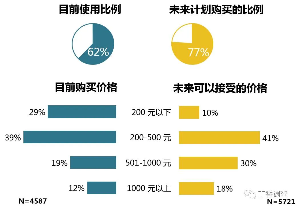 77% 的医生都有计划在未来三年内为家人/自己/朋友购买智能可穿戴医疗设备,仅有 23% 的医生表示暂时没有购买计划。目前购买过智能可穿戴医疗设备的医生中,只有 31% 的医生的花费是在 500 元以上;但对于未来有采购计划的医生而言,48% 的医生都可以接受 500 元以上的花费,表示未来医生愿意花费更多金额在智能可穿戴医疗产品上。