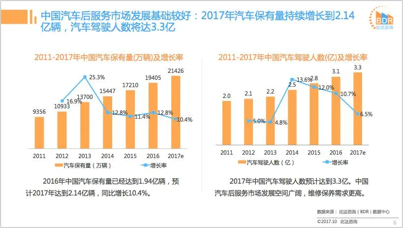 2016年中国汽车保有量已经达到1.94亿辆,预计2017年达到2.14亿辆,同比增长10.4%。2017年中国汽车驾驶人数预计达到3.3亿。中国汽车后服务市场发展空间广阔,维修保养需求更高。2017年中国汽车后市场规模预计将达到1.15万亿元,2018年将达到1.39 万亿元。2013-2017年中国汽车后市场规模呈现快速增长态势,未来随着我国汽车保有量不断增加,中国汽车后市场规模还将继续扩大,行业发展迅速。