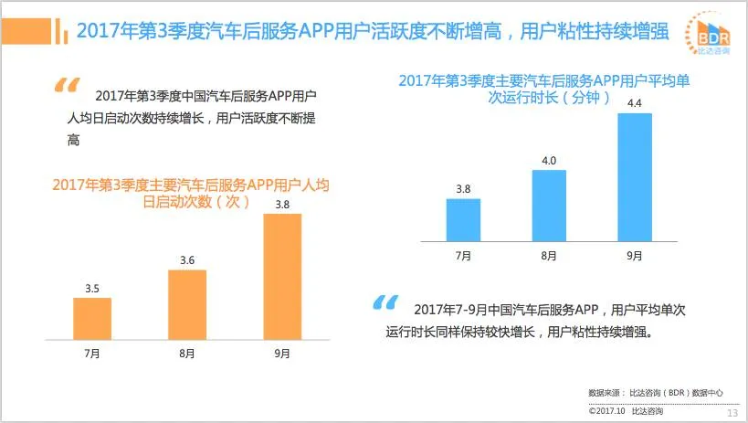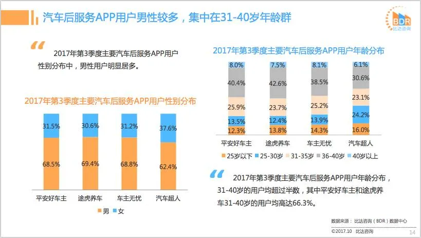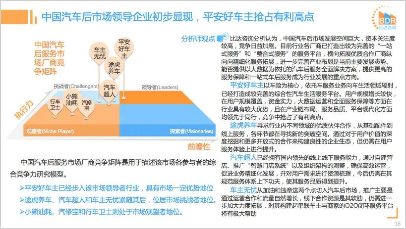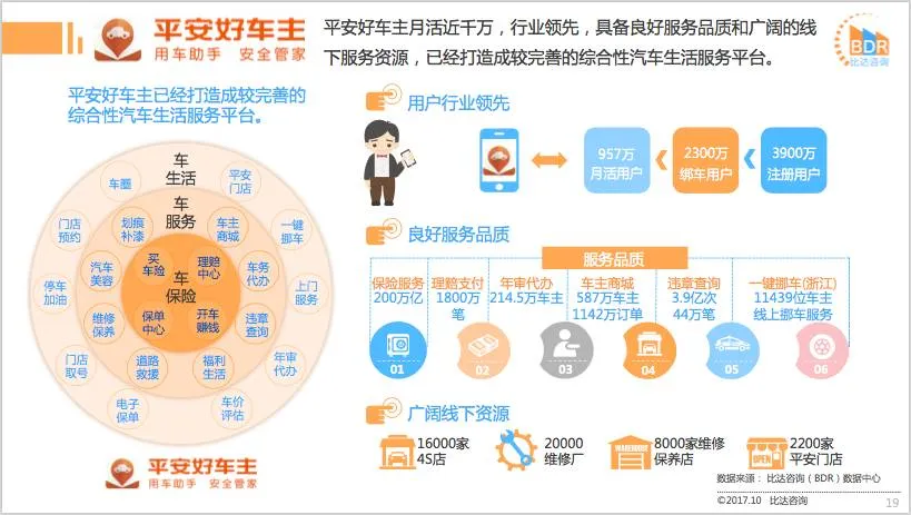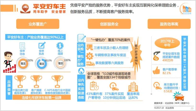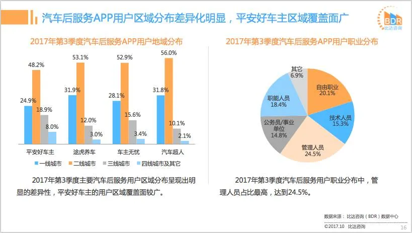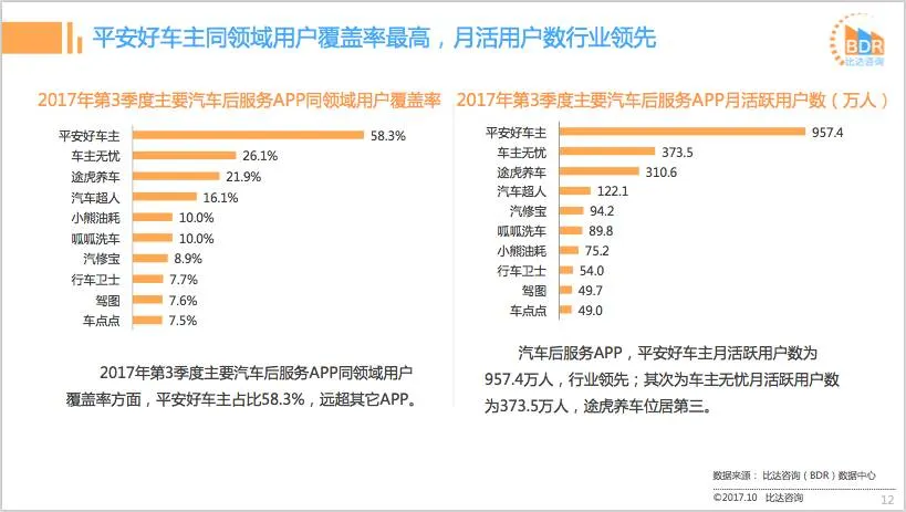 比达咨询(BDR)数据中心监测数据显示,汽车后服务APP,平安好车主月活跃用户数为957.4万人,行业领先;其次为车主无忧月活跃用户数为373.5万人,途虎养车位居第三。2017年第3季度主要汽车后服务APP同领域用户覆盖率方面,平安好车主占比58.3%,远超其它APP。