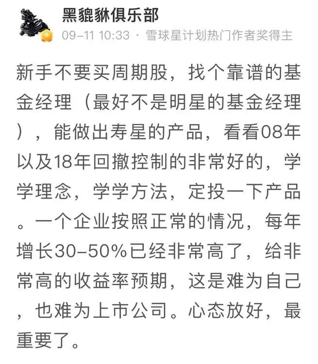 雪球用户黑貔貅俱乐部认为:新手不要买周期股,找个靠谱的基金经理,看看08年以及18年回撤控制的非常好的,学学理念,学学方法,定投一下产品。一个企业按照正常的情况,每年增长30-50%已经非常高了。给非常高的收益率预期,这是难为自己,也难为上市公司。心态放好,最重要了。