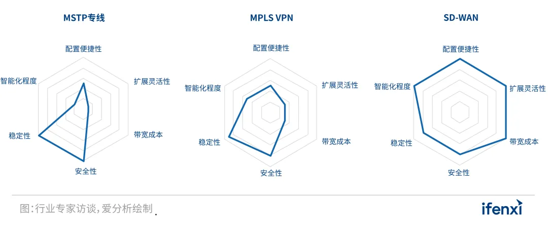 MSTP专线:由电信运营商为用户单独铺设,仅供用户独立使用,安全性和稳定性最高,但成本昂贵,前期部署周期长、后期运维难度高,配置便捷性和扩展灵活性较差。