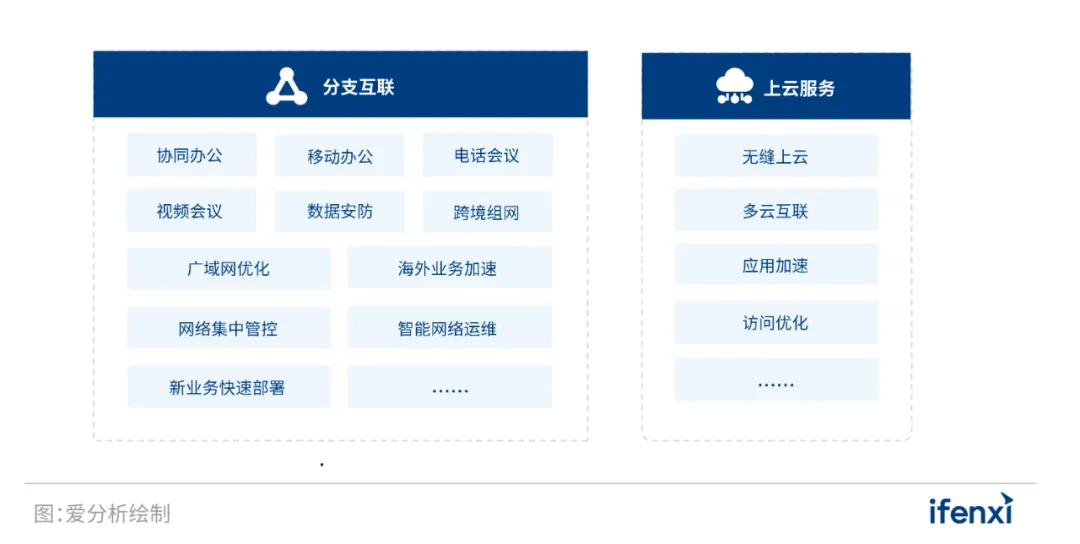 分支互联。SD-WAN厂商依托安全、可靠的WAN专线或骨干网资源,快速构建分支机构间的专属网络连接,实现高性能、安全可靠的互联互通,满足企业协同办公、电话会议、视频会议、数据安防、智能网络运维等业务需求。