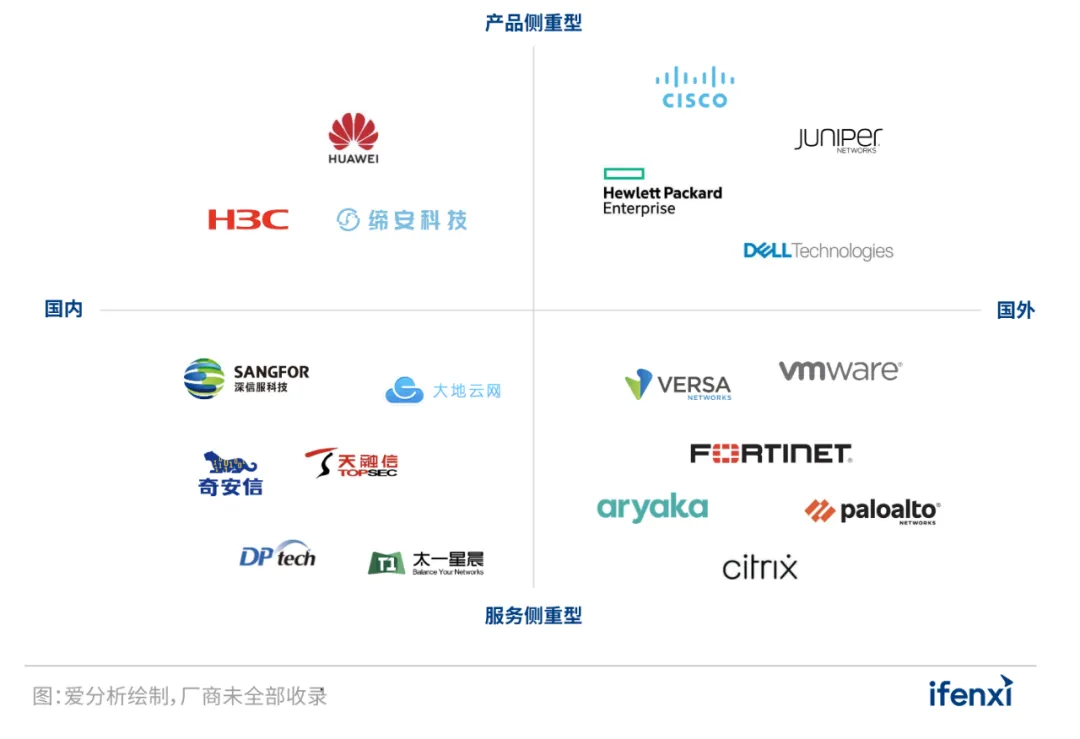 产品侧重型:产品侧重型厂商以销售设备、系统为主,辅以自主提供的服务或外包服务,具备完善的技术研发和设备销售能力,国内典型企业如华为、新华三、缔安科技等,国外典型企业如Cisco、Juniper Network、HPE等。