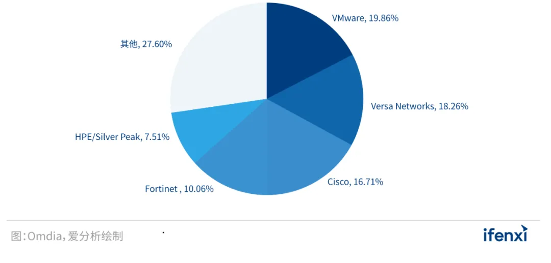 全球市场方面,市场研究机构Omdia调研数据显示,2021年上半年全球SD-WAN市场收入排名前五的供应商分别是VMware、Versa Networks、Cisco、Fortinet和HPE/Silver Peak,市场份额合计超过70%,市场收入向技术导向型企业集中的趋势愈发凸显。