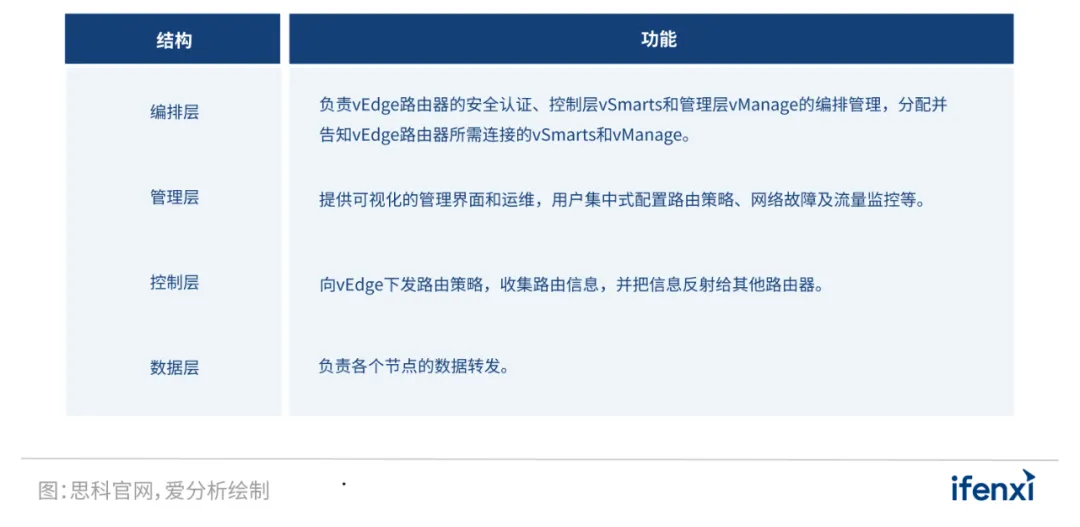 思科SD-WAN解决方案整体架构包括编排层、管理层、控制层和数据层四层。