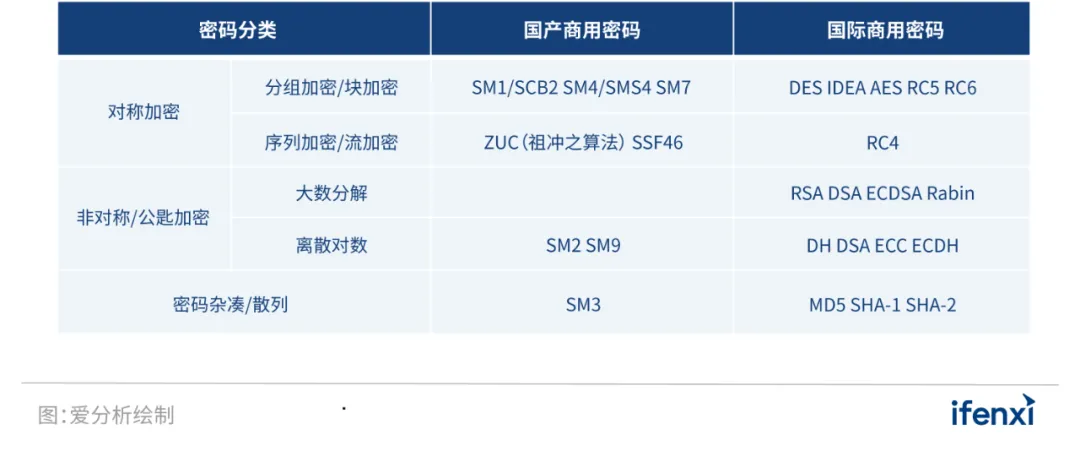 技术方面,商用密码通过密码算法编程技术、密码算法芯片、加密卡等技术,实现商用密码算法的加密、解密和认证等。目前,加密领域主要有国际算法和国密算法两种体系。国际算法由美国安全局发布,国密算法由国家商用密码管理办公室制定,包括SM1(SCB2)、SM2、SM3、SM4、SM7、SM9、祖冲之密码算法(ZUC)等,其中SM2、SM3、SM4、SM9、ZUC算法已相继纳入国际标准体系。国密算法与国际商业密码对应关系如下表所示:
