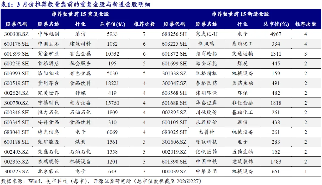 3月份中际旭创、中国巨石、紫金矿业、首旅酒店、寒武纪-U、新凤鸣、招商轮船等金股推荐次数靠前。3月份券商金股已经陆续发布,我们统计了全市场37家券商发布的金股,去重后金股数量合计为269只。我们按照相对上月是否新进,将全体金股分为新进金股和重复金股两类。在重复金股中,3月份推荐次数靠前的金股为:中际旭创(7次)、中国巨石(6次)、紫金矿业(6次)、首旅酒店(5次)、洛阳钼业(5次)等;在新进金股中,3月份推荐次数靠前的金股为:寒武纪-U(4次)、新凤鸣(4次)、招商轮船(3次)、潞安环能(3次)、凯格精机(2次)等。