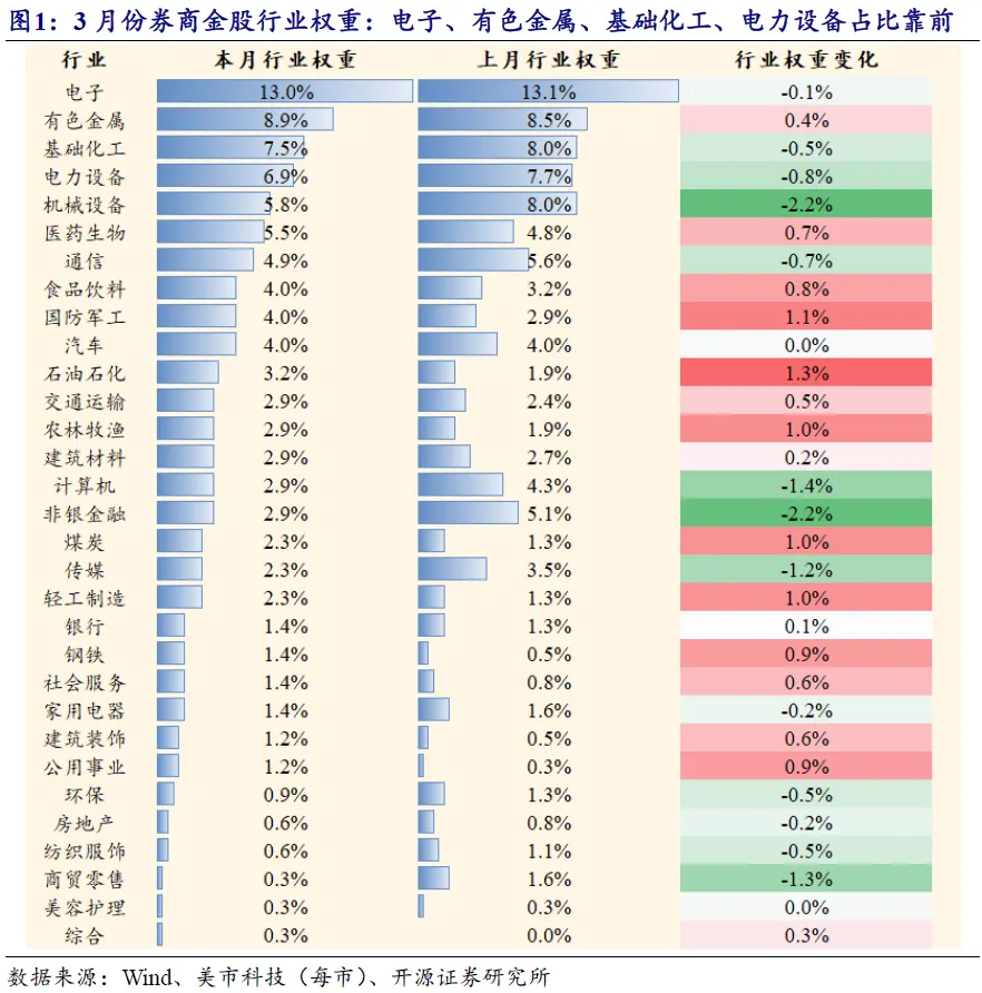 3月份电子、有色金属、基础化工、电力设备等行业金股数量占比靠前。3月份金股权重靠前的行业分别为:电子(13.0%)、有色金属(8.9%)、基础化工(7.5%)、电力设备(6.9%)。相比于上月,本月权重增加最多的行业为:石油化工(+1.3%)、国防军工(+1.1%)、农林牧渔(+1.0%);权重减少最多的行业为:机械设备(-2.2%)、非银金融(-2.2%)、计算机(-1.4%)。
