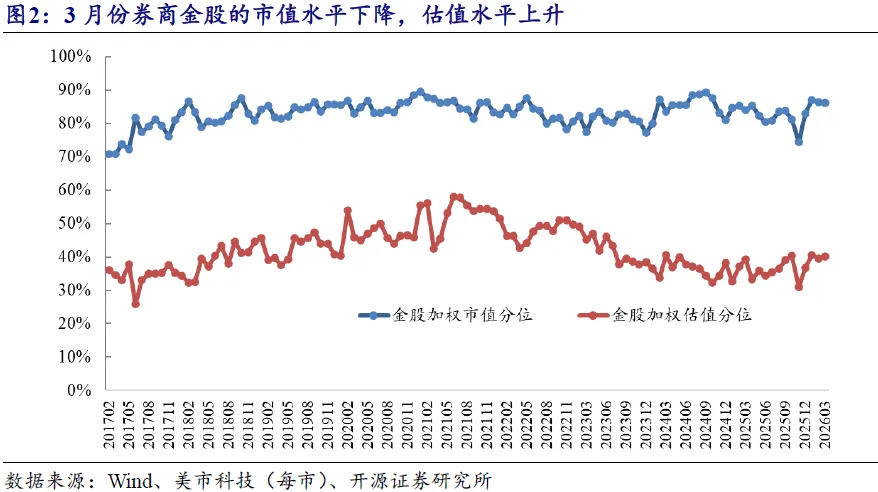 3月份券商金股的市值水平下降,估值水平上升。我们按月统计了金股行业内加权市值分位和估值分位水平。可以发现,3月份券商金股的市值水平下降,估值水平上升,或表明3月份券商金股转向成长风格。