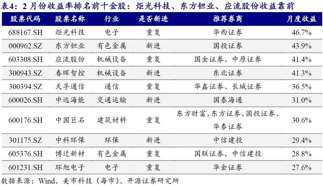 2月份炬光科技、东方钽业、应流股份、春晖智控、天孚通信等金股收益率排名靠前。我们统计了月度收益排名前十的金股明细,其中:炬光科技、东方钽业、应流股份、春晖智控、天孚通信等金股月度收益靠前,2月份收益率分别为46.7%、43.9%、41.4%、41.3%、36.5%。