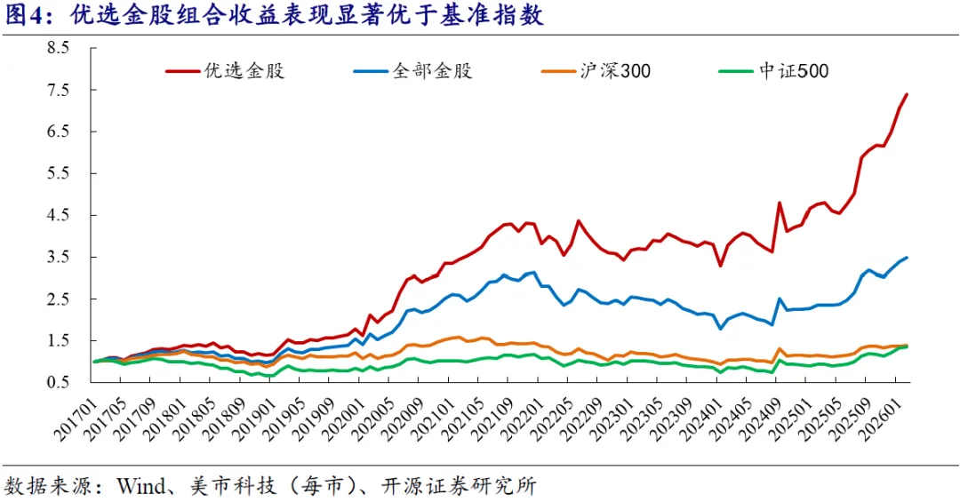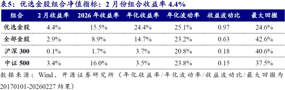 开源金工优选金股组合2月份收益率为4.4%,2026年相对中证500超额-0.5%。全历史区间内,优选金股组合年化收益率为24.4%,收益表现优于全部金股组合。优选金股组合2月份收益率为4.4%;2026年以来收益率为15.5%,2026年相对中证500超额-0.5%。
