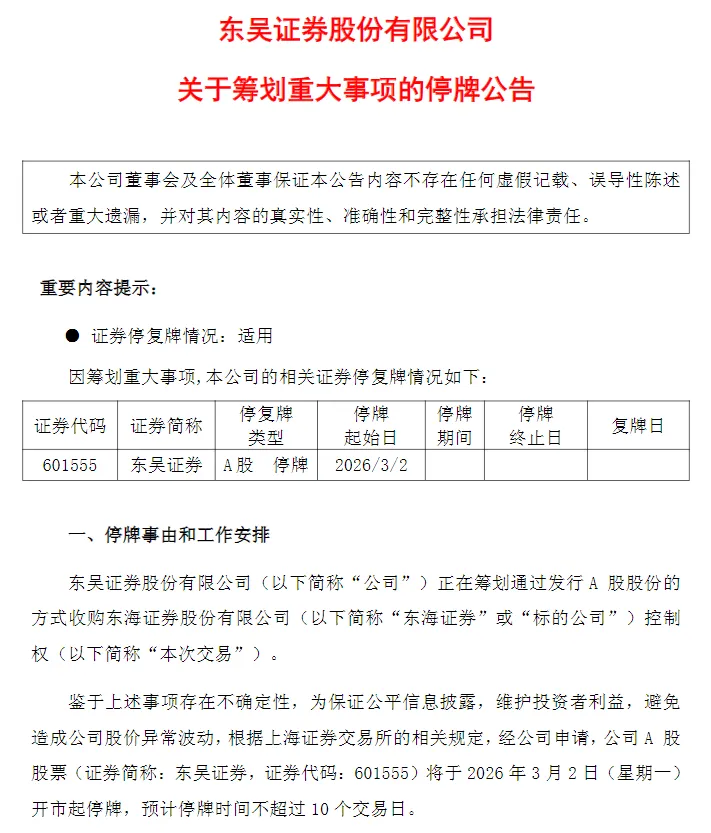 3月2日早间,东吴证券(601555.SH)公告,公司正在筹划发行股份收购东海证券控制权事项。因该事项存在不确定性,为维护投资者利益,公司股票自2026年3月2日开市起停牌,预计停牌时间不超过10个交易日。