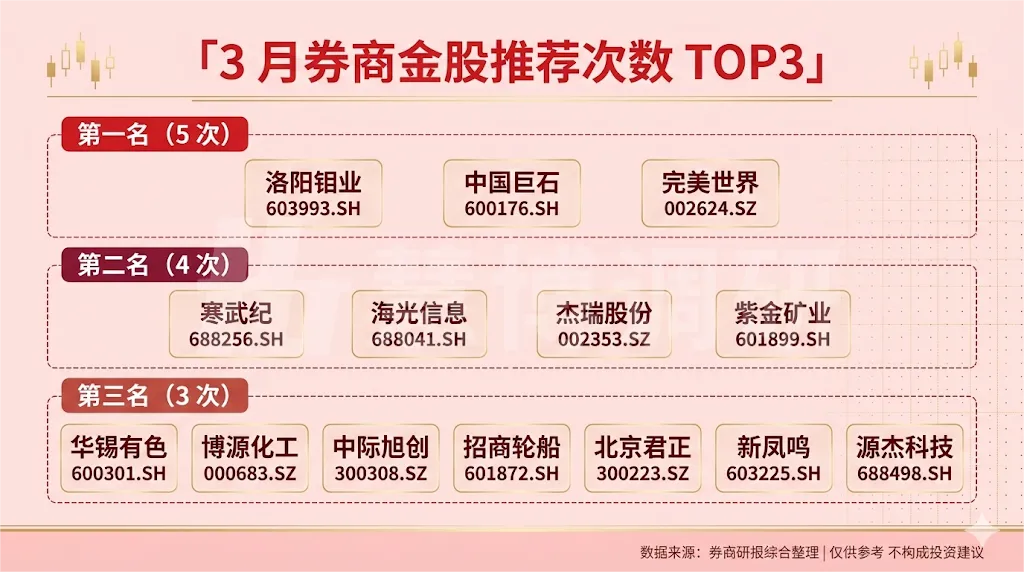 从个股方面来看,洛阳钼业、完美世界、中国巨石获机构推荐次数居前;海光信息、寒武纪、杰瑞股份、紫金矿业等标的同样受到多家券商集中青睐。