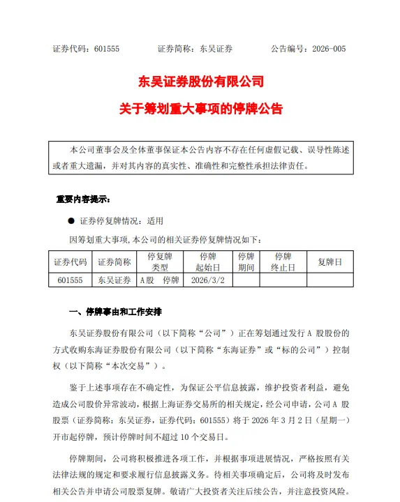 据悉,东吴证券自3月2日开市起正式停牌,预计停牌时间不超过10个交易日,本次交易最终对价、发行价格、股份锁定等核心细节,仍需双方进一步协商,并履行监管部门审批及公司内部决策程序。