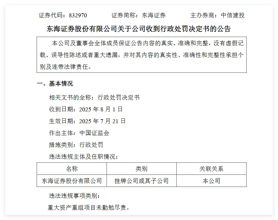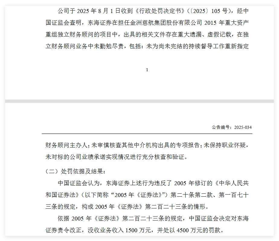 合规方面,2025年8月,东海证券因在金洲慈航重组项目中未勤勉尽责,违反证券法律法规,被中国证监会罚没合计6000万元。这一处罚金额对公司现金流及盈利能力形成显著冲击。