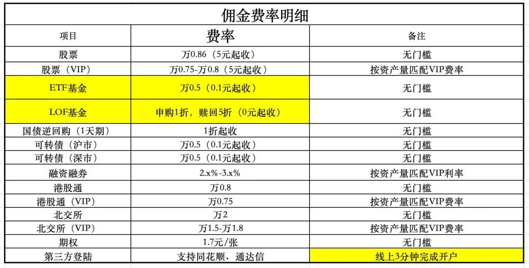 享受VIP佣金费率:股票万0.86,ETF/可转债万0.5,国债逆回购1折,详细费率如下: