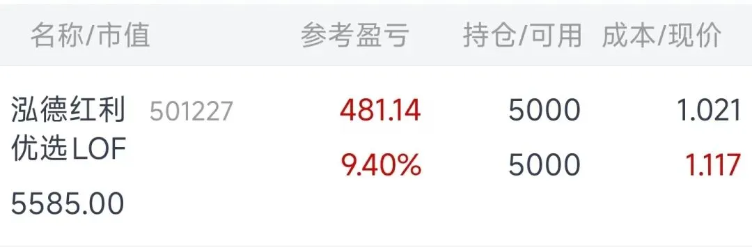 以前真没注意这个问题,主要是最开始在东财买了挂旗杆就没管,后来在支付宝定投,支付宝说输赢多少就是多少,资金进进出出太混乱,也没去细究。直到今年开始好好学习套利,开始记录操作,才发现这个成本不准的问题,以前也发现申购、赎回导致的成本差异我可能找到价差原因了。这次发现的问题是买卖导致的,说券商记录有问题吧,其实也没错,但确实对初学的我带来很大的困惑,影响了我的判断,属于成本陷阱了。节前我陆陆续续买入多次红利LOF,可以计算出成本是1.08,然后我12号卖出了10000份,当时成本显示是1.059(忘记截图),我当时觉得差异,咋成本变低了呢?但没下来好好算。年后24号,又卖出5000份,成本显示是1.021,更加低了,我甚至产生了我把这5000份卖出就能赚481.14元的错觉,是不是有和我一样朋友?周末,我把这个好好的算了下,终于搞明白了这是什么原因。先举个简单的例子,来说明券商是怎么计算这个成本的:假如我有20000份,成本1,涨到1.1卖出10000份后,成本显示为0.9盈利:(1.1元-1元)*10000份=1000元我盈利了1000元,那么剩下的10000份就是用更低的成本买入(扣除掉盈利部分)。总成本:20000份*1.0802元=21603.86元12号卖出:10000份*1.101元=11010元21603.86元-11010元=10593.86元10593.86元/10000份=1.059386元(这就是12号卖出后显示的成本1.059)5103.86元/5000份=1.020772元(24号卖出后显示的成本1.021)简单来说券商是用剩余持仓金额/剩余持仓份数来计算的新成本,确实没错,因为我前面的卖出已经获益了,所以现在的成本显示很低,而前面显示的参考盈亏481.14元其实是指按目前1.117卖出手上的5000份后,该标的的累计收益,但是这个确实很影响判断,假如价格跌倒1.07参考盈利也是红的,但是手上持有的5000份其实是亏损的。目前我能想到的办法就是手动记账,不然进出多了,会很混乱,不好确定真实成本。1、以2.685买入15000份国投资源LOF(161217),折价1.01%周末我以为仗算打完了,所以虽然看到石油、黄金都涨,但是今天我A大宗、国投这些高开下跌,就没想参与,结果又起飞了,下午想想还是搞一搞吧,希望明天别被埋,至少目前石油、黄金都还在涨,晚上别闹幺蛾子。大宗商品LOF(161715)没有挂进去,后面价格涨太高就没敢追,主要是折价修复很快泓德红利优选LOF(501227)变溢价了,还有5000份没清仓,这个票可以长持,留下作底仓标普500LOF(161125):10*6*2=120元标普信息科技LOF(161128):10*6*2=120元纳斯达克100LOF(161130):10*6*2=120元标普500LOF(161125):10*1=10元,每日定投