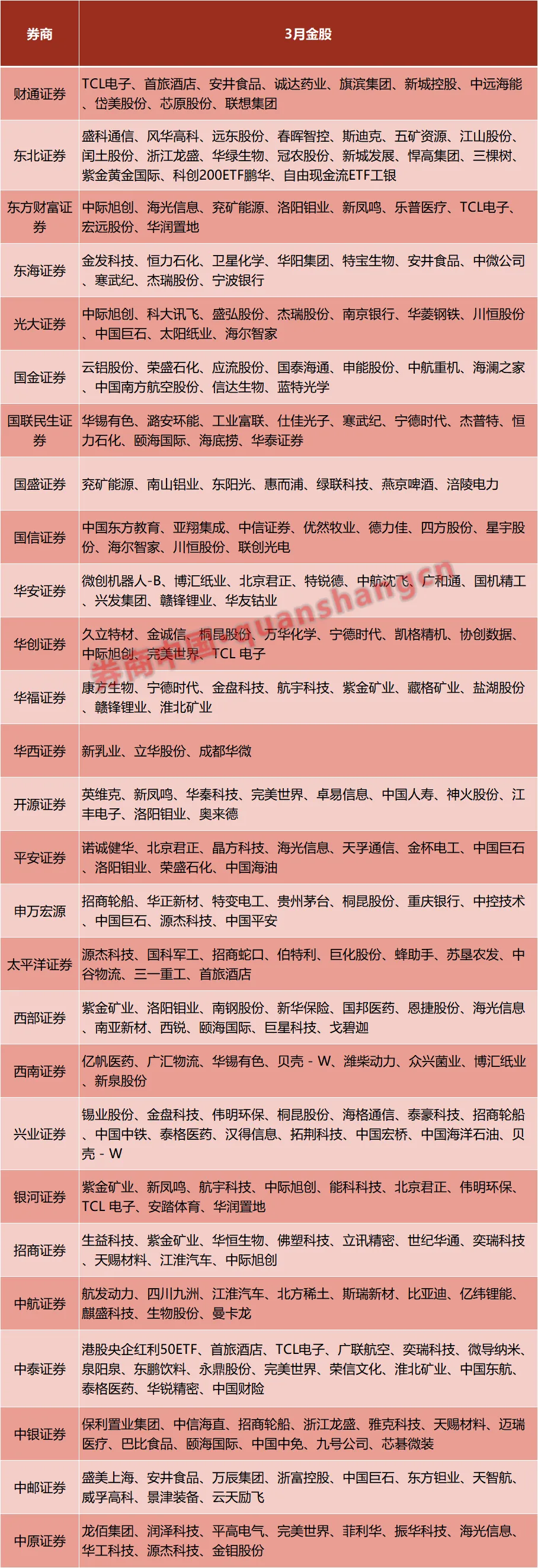 近日,券商3月金股名单出炉,电子、有色金属、电力设备成为券商扎堆推荐的三大核心赛道。