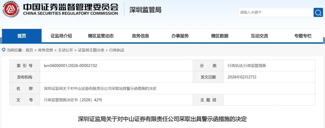 经查,中山证券有限责任公司经纪业务展业过程中,存在对分支机构及从业人员管理薄弱、营销宣传不规范、与互联网第三方平台营销合作管控不到位等问题。上述情形违反了《证券经纪业务管理办法》(证监会令第204号)第十条第一款、第三十四条第一款,《证券公司和证券投资基金管理公司合规管理办法》(证监会令第166号)第三条、第六条第四项的规定。你作为合规总监,对公司相关违规行为负有责任。根据《证券经纪业务管理办法》第四十三条、《证券公司和证券投资基金管理公司合规管理办法》第三十二条第一款的规定,我局决定对你采取出具警示函的行政监管措施。如对本行政监管措施不服,你可在收到本决定书之日起60日内向中国证券监督管理委员会提出行政复议申请(行政复议申请可以通过邮政快递寄送至中国证券监督管理委员会法治司),也可以在收到本决定书之日起6个月内向有管辖权的人民法院提起诉讼。复议和诉讼期间,上述行政监管措施不停止执行。
