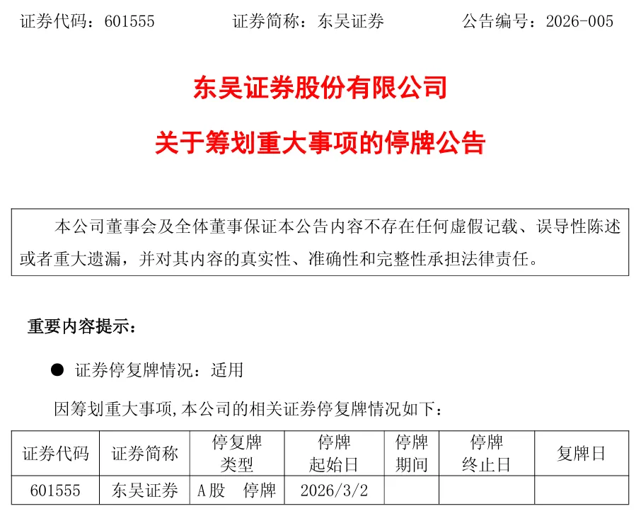 公告称,本次交易尚处于筹划阶段,存在不确定性。为保证公平信息披露,维护投资者利益,避免造成公司股价异常波动,东吴证券A股股票(601555)已于2026年3月2日开市起停牌,预计停牌时间不超过10个交易日。停牌期间,公司将积极推进各项工作,并及时履行信息披露义务。最终交易方案、交易对价等具体内容以后续公告的发行股份购买资产预案或报告书为准。