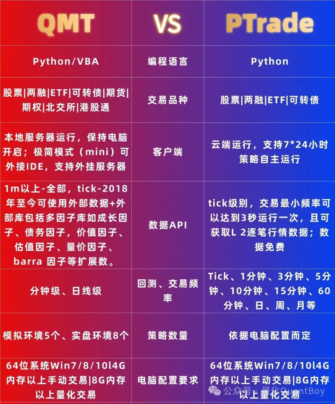 在选择量化软件时,大家还是跟从最主流的QMT和PTrade入手,毕竟大厂出品,容错还是比较小,且适配人群都很广,大家可以参考一下。