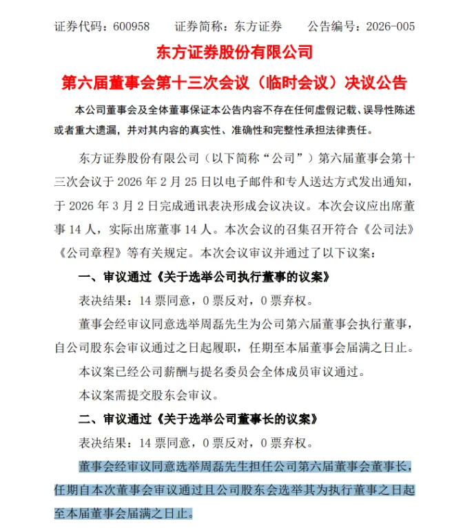 3月2日,DF证券发布董事会决议公告,选举周磊先生为公司董事长、执行董事和董事会战略与可持续发展委员会主任委员、薪酬与提名委员会委员,均自公司召开临时股东会审议通过选举其为公司执行董事之日起履职。