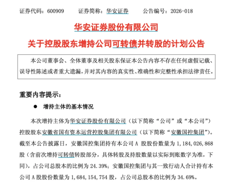 华安证券3月3日发布的最新公告显示,基于对公司未来持续稳定发展的信心和长期投资价值的认可,为巩固控股股东地位、增强投资者信心,安徽国控集团拟继续通过购买公司可转债并转股的方式增持公司股份。