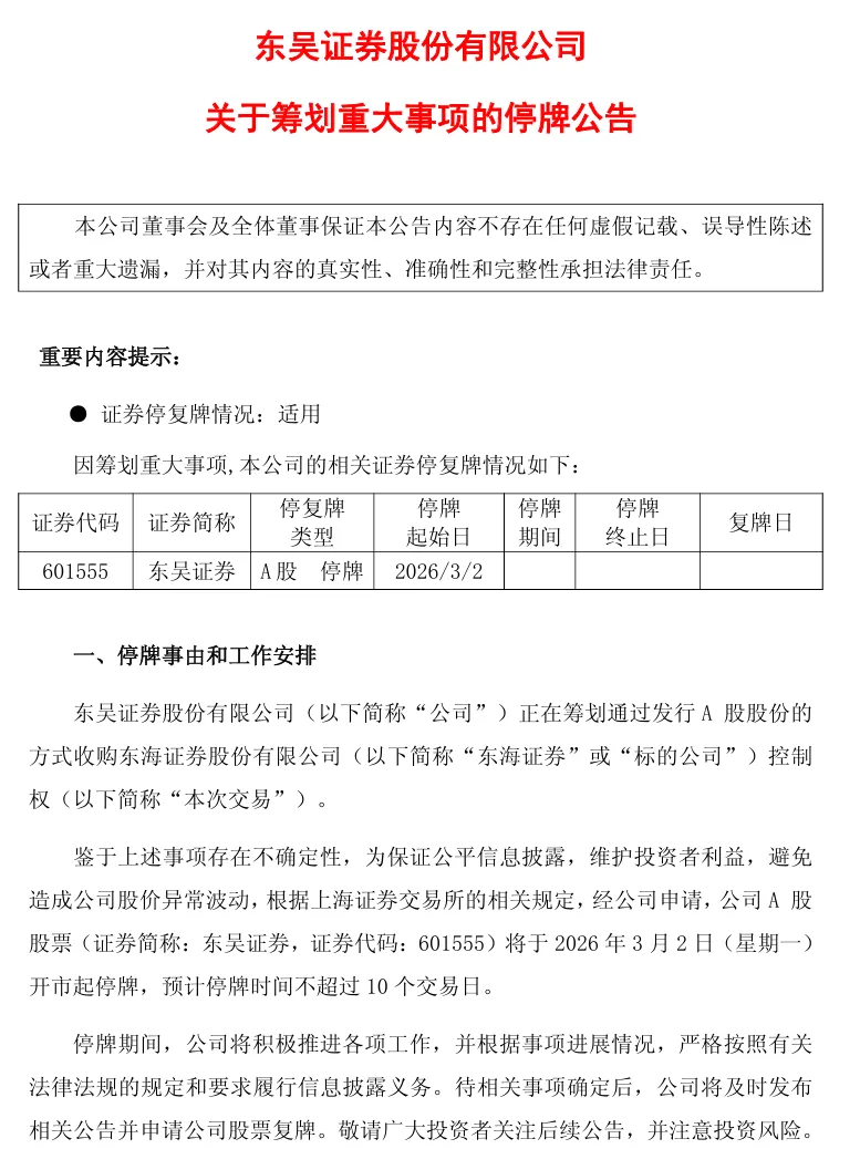 3月2日,东吴证券(601555.SH)公告,正在筹划发行股份收购东海证券控制权事项。因该事项存在不确定性,公司股票自3月2日开市起停牌,预计停牌时间不超过10个交易日。