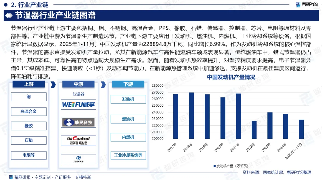 产业链核心节点:根据国家统计局数据显示,2025年1-11月,中国发动机产量为228894.8万千瓦,同比增长6.99%。作为发动机冷却系统的核心温控部件,节温器的需求直接受发动机产量拉动,尤其在新能源汽车与高性能燃油车领域表现显著。传统燃油车中,蜡式节温器仍占主导,其成本低、可靠性高的特点适配大规模生产需求。然而,随着发动机热效率提升,对温控精度要求提高,电子节温器凭借0.1℃级精准控温、快速响应(<1秒)及动态调节能力,在新能源热管理系统中加速渗透,支撑发动机在最佳温度区间运行,降低油耗与排放。